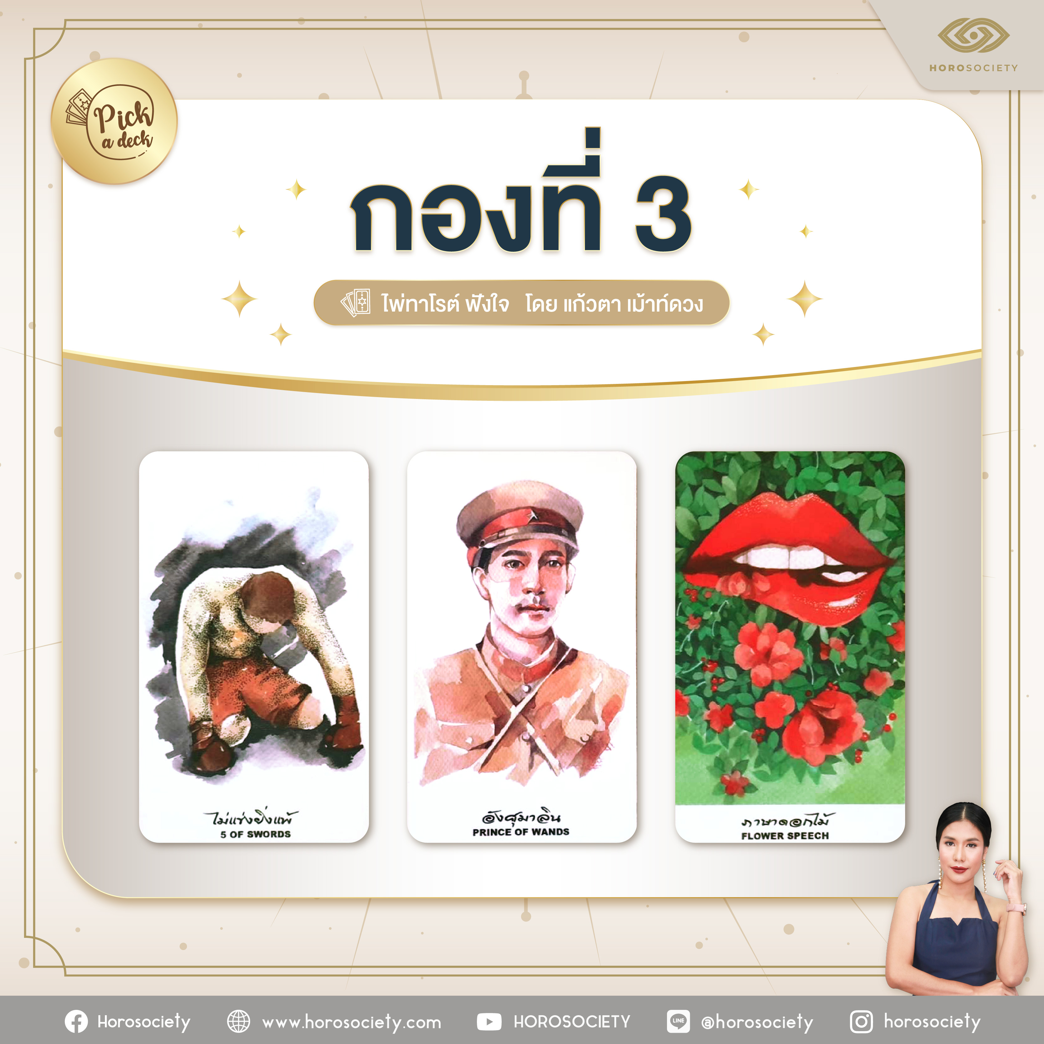 ใครเลือกไพ่กองที่ 3 นี้ บอกได้คำเดียวเลยว่ารอบนี้คุณต้องพักก่อน! เพราะโชคลาภจากการเสี่ยงโชคหรือเสี่ยงทายนั้นเป็นศูนย์เลยค่ะ เพราะที่ผ่านมาคุณมักจะรับบทนักสู้ยืนหนึ่งมาโดยตลอด และไม่เข็ดกับคำว่าฝากเอาไว้ก่อน ก็ไอ่เรามักจะเจ็บแล้วไม่จำอะเนอะ T.T แต่หากพูดถึงโชคลาภจากการทำมาหากินนั้นยังพอมีความเป็นไปได้อยู่นะ ดังนั้นช่วงนี้ขอแนะนำให้คุณเน้นทำงานแลกเงินจะดีกว่า ยึดคติ “ไม่เห็นเหงื่อก็ไม่เห็นเงิน” ท่องเอาไว้และจำให้ขึ้นใจนะ