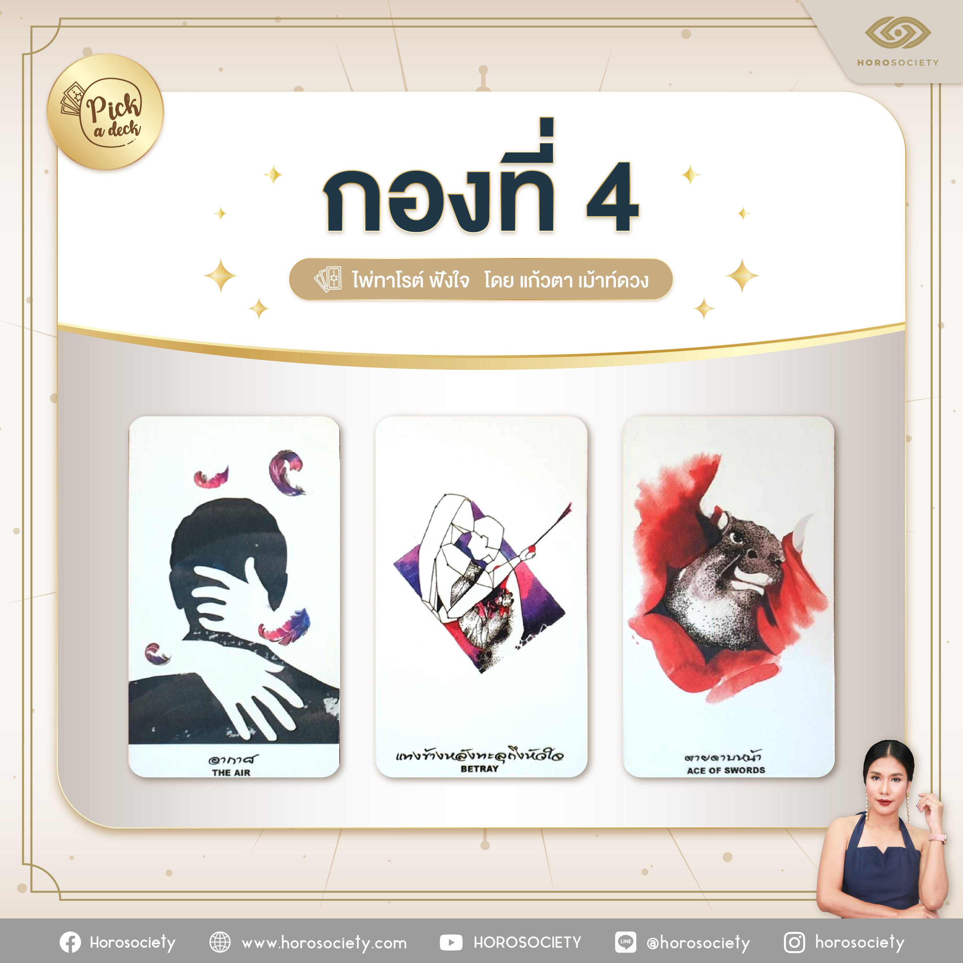 กองสุดท้าย! กองที่ 4 สำหรับเรื่องโชคลาภของคนที่เลือกไพ่กองนี้ก็ควรต้องพักก่อนเช่นเดียวกันค่ะ เพราะในช่วงนี้เรียกได้ว่าดวงโชคลาภยังไม่มา ดังนั้นควรเลี่ยงการเสี่ยงโชคต่าง ๆ ออกไปก่อน และหากว่าคุณคิดจะมูโดยการไปไหว้พระขอพรหรือบนบานจากสิ่งศักดิ์สิทธิ์ต่าง ๆ ในตอนนี้ก็ทำได้เพียงฝากไว้ก่อนเท่านั้น แนะนำว่าให้ทำใจเย็น ๆ เอาไว้ก่อนดีกว่า ช้า ๆ ได้พร้าเล่มงามนะ แต่ก็เข้าใจได้แหละว่าเรามันเลือดนักสู้เนาะ งวดนี้ไม่ได้ งวดหน้าก็เอาใหม่อีก จนกว่าจะสำเร็จนั่นแหละ อย่างไรก็เบา ๆ ไว้หน่อยแล้วกัน เดี๋ยวจะหาว่าไม่เตือน และอย่าลืมเช็กเงินในกระเป๋ากันด้วยนะ